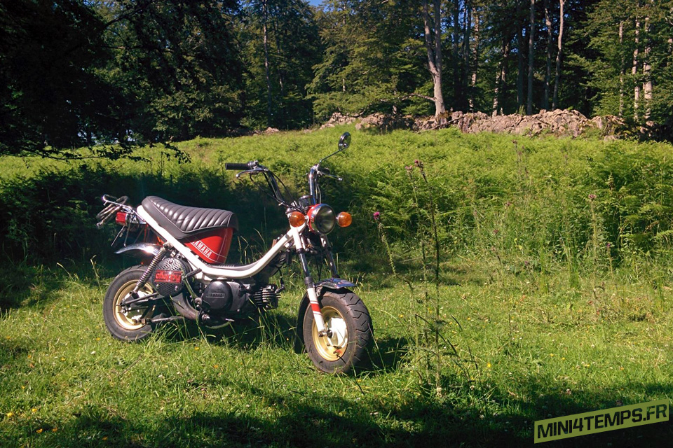 Le Yamaha Chappy de Vincent est un type 543 suisse de 1974, donc un modèle avec une selle monoplace à ouverture arrière. Il a le classique kit Polini, la boite à clapets double et phbg19mm, et le moteur est un 4 vitesses à embrayage manuel (d’origine).